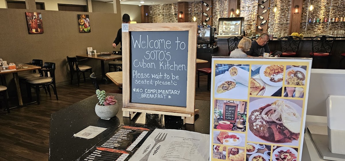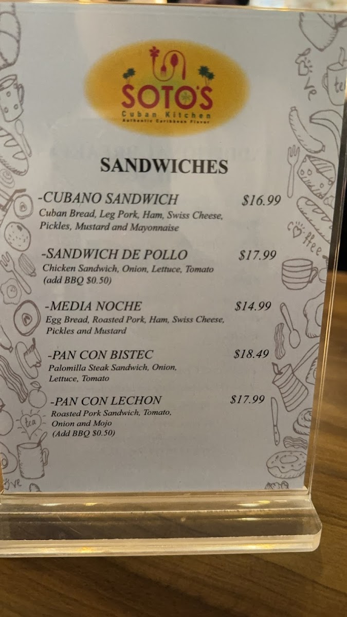 The menu at Soto's Cuban Kitchen offers a wide variety of flavorful Cuban dishes, showcasing traditional and authentic tastes. For dessert, diners can enjoy rich options like Flan Cubano and Tres Leches Cake, along with indulgent choices like Chocolate Cake and Arroz Con Leche. For those craving beef, the menu features hearty selections such as Rabo Encendido (Oxtail Stew), Lomo Saltado (Rib Eye Steak), and Ropa Vieja, alongside Bistec De Palomilla (Grilled Palomilla Steak) and T-Bone Steak. The sandwich offerings include the classic Pan Con Lechon (Roast Pork Sandwich) and Cubano Sandwich, while the seafood section highlights dishes like Camarones Al Ajillo (Shrimp in Garlic Sauce) and Grilled Salmon. Vegetarian options, such as Moros (Rice and Black Beans), Yuca Al Mojo, and Platanos, offer a delicious, plant-based alternative. The restaurant also serves popular Cuban appetizers, including Yuca Rellena and Ham Croquettes. On the beverage side, customers can choose from a selection of Cuban sodas like Malta Hatuey and Inca Cola, or opt for refreshing milkshakes and fruit-based drinks. With a rich variety of flavorful dishes across all categories, Soto's Cuban Kitchen delivers an exceptional dining experience filled with both traditional Cuban comfort food and vibrant tastes.